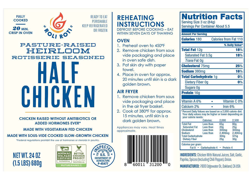 PASTURE-RAISED HEIRLOOM FULLY COOKED HALF CHICKEN INGREDIENTS: